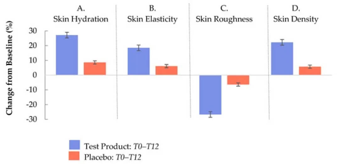 Collagen supplementation improves skin hydration, elasticity, roughness and density up to 30%.